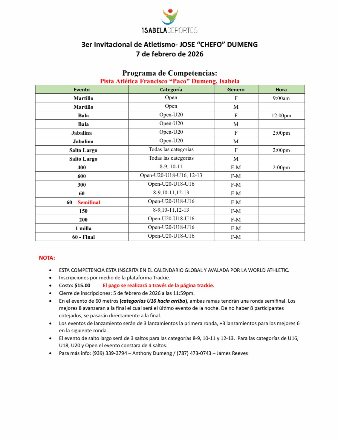 Inscripcion $ 15.00 + $3.00 Cargos por servicio